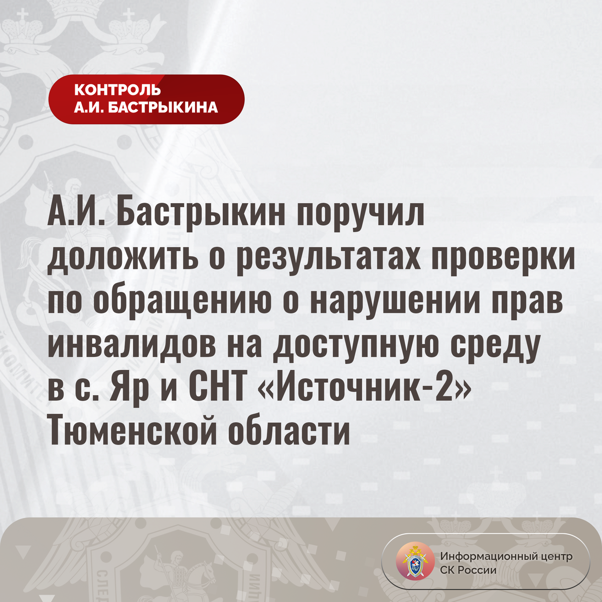 #СледственныйКомитет #СКРоссии #СКР #ИЦСКР #ИнформационныйЦентр #АлександрБастрыкин #ПредседательСКР #КонтрольПредседателяСКР #КомментарийКонтроль #ТюменскаяОбласть