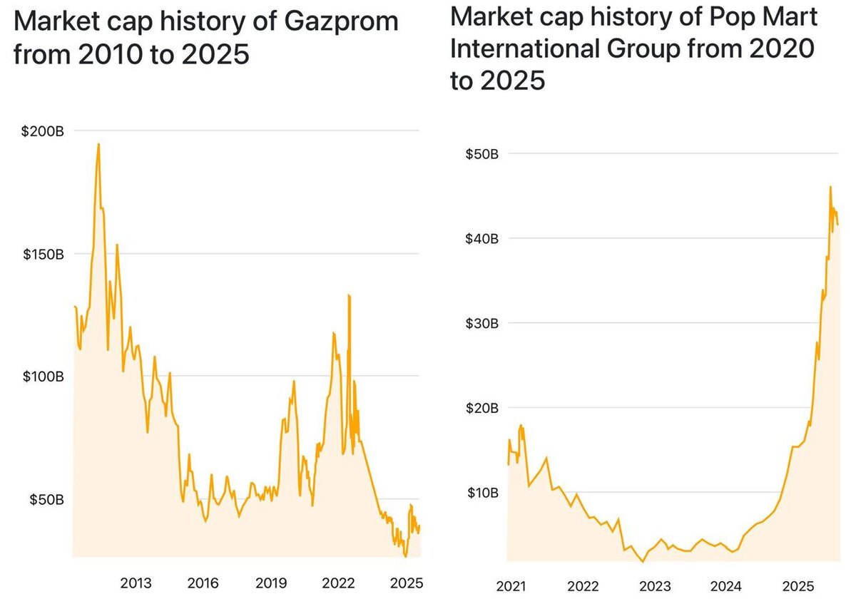 Мы инвестировали не в то Китайский производитель коллекционных игрушек Pop Mart теперь стоит дороже «Газпрома». Рыночная капитализация Pop Mart составляет 41,52 млрд долларов, в то время как «национальное достояние» — 38,28 млрд долларов, по данным CompaniesMarketCap. Три года назад стоимость «Газпрома» превышала 130 млрд долларов. Теперь же компанию обошёл бренд, известный фигурками Labubu и другими игрушками в капсулах, ставшими хитом в Азии и за её пределами. 💼 Rozetked | Подписаться