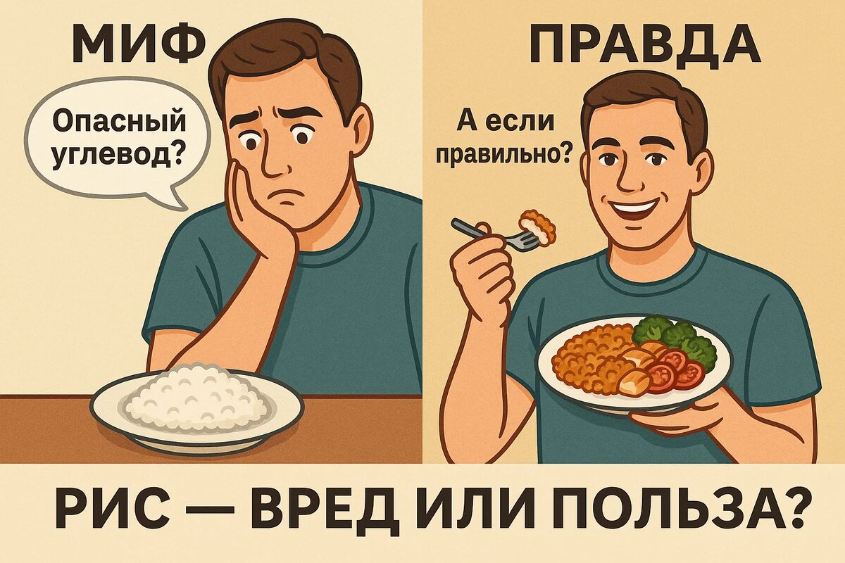 Рис — один из самых противоречивых продуктов на кухне. Кто-то боится его как огня, считая «белой смертью», а кто-то спокойно ест его каждый день и при этом прекрасно выглядит. Разбираемся, где правда, а где — миф. ✔️ ПРАВДА: Рис — источник сложных углеводов, а не простых сахаров. Это значит, что он медленно усваивается и даёт энергию надолго. Проблема начинается не с самого риса, а с того, чем Вы его дополняете: жирные соусы, жареное мясо, сливочное масло — вот настоящие виновники «наборов». Если Вы едите варёный или тушёный рис с овощами, белком и контролируете порцию — он не мешает снижению веса. ✔️ ПРАВДА: Белый рис прошёл шлифовку, поэтому действительно содержит меньше клетчатки. Но он легче усваивается и может быть полезен, особенно в восстановлении после тренировки или при проблемах с ЖКТ. Да, бурый рис полезнее по составу, но это не значит, что белый — вреден. Всё зависит от Ваших целей, общего рациона и баланса нутриентов. ✔️ ПРАВДА: На самом деле рис не вызывает отёков. Бо