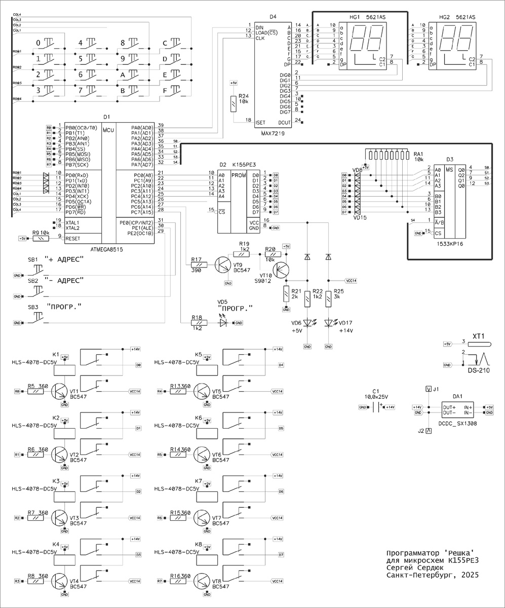 Всех приветствую! Для программирования микросхемы К155РЕ3 существует несколько схем программаторов, как полностью с ручным управлением, так и полуавтоматическим. В этих программаторах используется ручной набор программируемого адреса и данных, что может привести к ошибке при невнимательном наборе. А так как микросхема одноразовая, то её придётся выбросить. При использовании визуального отображения адреса и данных вероятность допустить ошибку сильно уменьшается. Чтобы программировать такую микросхему без применения каких-либо компьютерных средств, была разработана схема на микроконтроллере. Схема программатора представлена ниже: Программатор состоит из управляющего микроконтроллера ATmega8515, клавиатурного блока "0".."F", кнопок SB1..SB3, блока отображения текущих адреса и данных на микросхеме MAX7219, блока считывания данных на микросхеме К555КП11 (аналог SN74ALS257) и блока реле К1...К8, управляемого транзисторами VT1..VT8. Повышатель напряжения программирования применён в виде готов