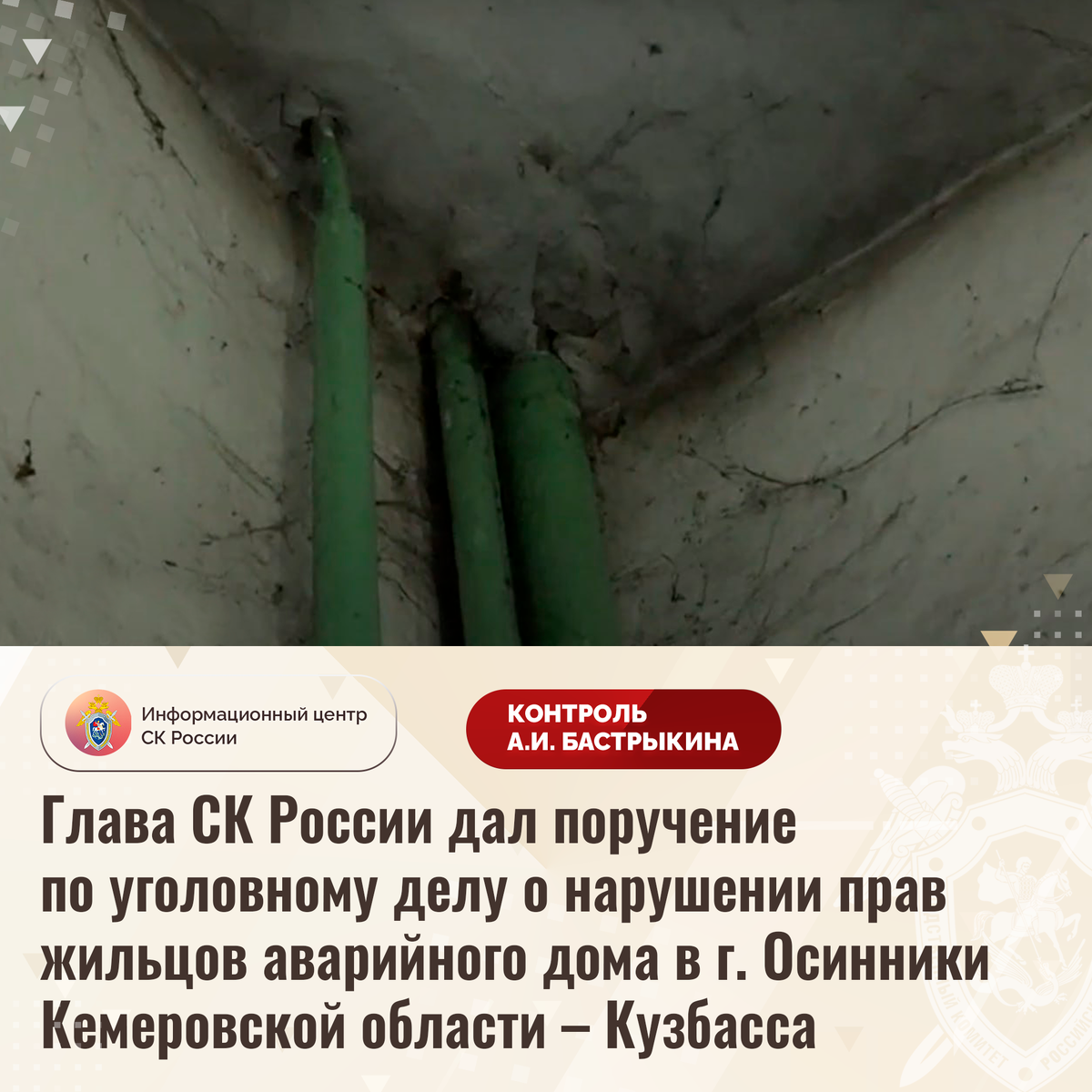 Глава СК России дал поручение по уголовному делу о нарушении прав жильцов аварийного дома в г. Осинники Кемеровской области – Кузбасса В Информационный центр СК России поступило обращение по вопросу нарушения прав жильцов многоквартирного дома на улице Вокзальной города Осинники Кемеровской области – Кузбасса. Фундамент, кирпичная кладка и несущие конструкции здания, 1983 года постройки, разрушаются, коммуникации неисправны, горячее водоснабжение отсутствует. Кроме того, в зимний период температурный режим в жилых помещениях не соответствует установленным нормативам, а повышенная влажность привела к образованию на стенах плесени. С 2013 года граждане за счет собственных средств неоднократно проводили обследования строения, по результатам которых оно признавалось непригодным для проживания. Однако статус аварийного присвоен дому лишь в 2018 году, из-за чего в ближайшую программу расселения он не включен. Многочисленные обращения в различные инстанции результатов не принесли. Ситуация ос