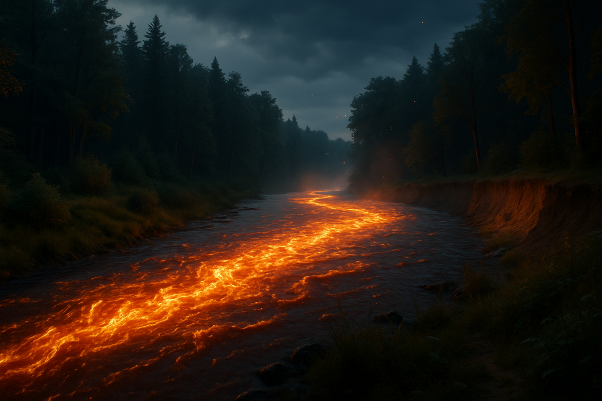 Эта река — метафора внутренних кризисов, переходов, личных апокалипсисов. Она горит, потому что проход через неё обжигает. Иногда — до боли, иногда — до очищения. Мы встречаем эту реку, когда теряем, когда выбираем, когда взрослеем, когда отпускаем. Она пылает под нашими шагами, когда мы решаем стать собой, несмотря ни на что.
