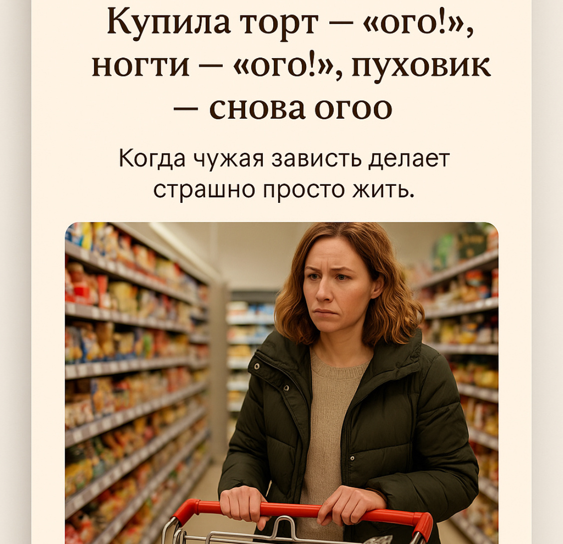 Когда-то я думала, что зависть — это яркое, чёрное, как тушь по щеке. Что она вырывается открыто: крик, упрёк, злость. Что она видна. Узнаваема. Что её можно отследить, как запах дыма — и уйти вовремя. Но нет. Зависть — это шёпот. Это косой взгляд. Это «ого», сказанное с таким тоном, что в тебе что-то сжимается. — Ого, ты торт купила? — Маша поставила сумку на стул и уставилась в мой холодильник, будто я туда спрятала Мону Лизу. — Угу, скидка была. За 300 рублей. — Просто… не праздник же. — Ну, захотелось сладкого. Она пожала плечами. — Ну ты, конечно… умеешь жить. Эта фраза повисла в воздухе. Я улыбнулась, как дура, закрывая холодильник, хотя хотелось сказать: да, умею жить. В съёмной квартире, с двумя детьми, и кредитом на зубы мужа. Мы дружили лет пятнадцать. Одно время были неразлучны. Школа, институт, работа. Сначала всё было по-братски: если у одной нет — у обеих нет. Делили пиццу на троих. Одолжали платья. Дарили духи с рук. Но потом Маша купила квартиру — и будто