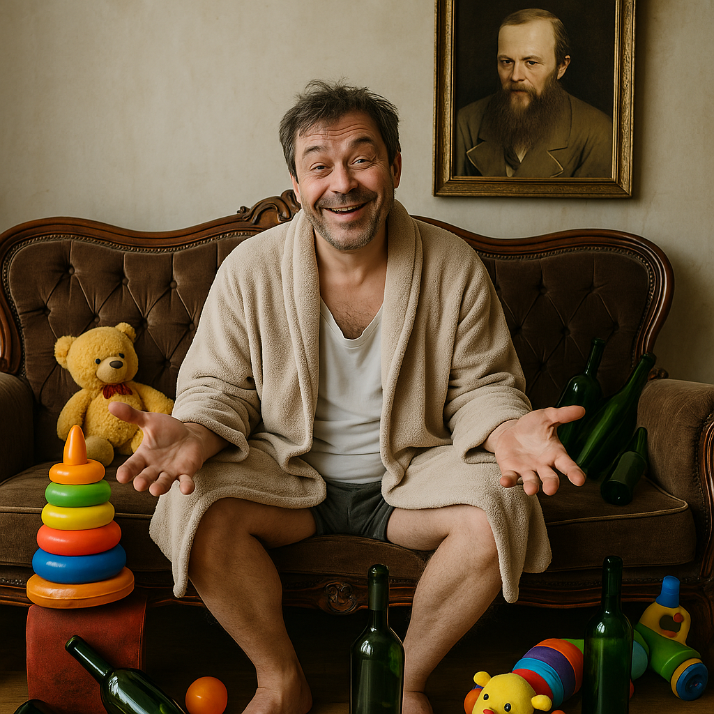 Но ведь, казалось бы, всё есть для многодетного счастья: достаток, усадьба, харизма, а главное — полное отсутствие какого-либо самоконтроля и чувства ответственности. Фёдор Павлович — это не просто «неидеальный родитель». Это целый демографический антимерч. Его подход к воспитанию звучит примерно так: «Дети, дети… какие дети?». Чем не герой нашего времени?