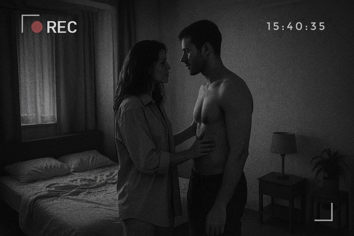 На экране было четкое видео: она и незнакомый мужчина, страстно целующиеся, двигающиеся к кровати. Камера была установлена так, что захватывала почти всю комнату.