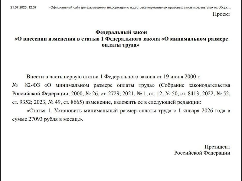 В России МРОТ в следующем году может вырасти сразу на 20,7% В России минимальный размер оплаты труда (МРОТ) в 2026 году может составить 27 093 рубля. С предложением увеличить его на 20,7% выступил Минтруд. "Принятые подходы к установлению минимального размера оплаты труда позволяют обеспечивать выполнение поручения президента по опережающему росту МРОТ. С учетом сложившегося уровня медианной заработной платы в 2026 году минимальный размер оплаты труда предлагается установить на уровне 27 093 рубля. Таким образом, МРОТ увеличится на 20,7%, то есть - выше инфляции", - цитируют министра труда и социальной защиты РФ Антона Котякова коллеги с ТАСС. МРОТ не должен быть меньше 48% медианной зарплаты за 2024 год. По данным Росстата, медианная зарплата в прошлом году составила 56 443 рубля. В 2025 году МРОТ в России составляет 22 440 рублей в месяц, в 2024 году — 19 242 рубля.