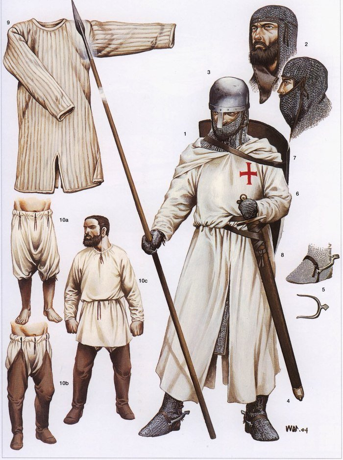 Как уже говорилось, полный доспех был спецодеждой. В повседневной жизни рыцарь носил то же, что и любой другой аристократ его времени. И эта одежда была куда более гигиеничной, чем принято думать. Основой всего было нижнее бельё. Мужчины носили брэ — просторные полотняные штаны, доходившие до колен, и камизу — длинную рубаху, тоже из полотна. Именно полотно, то есть лён, было ключом к гигиене. В отличие от шерсти, лён прекрасно впитывает пот, быстро сохнет и легко стирается. И его стирали, причём регулярно. У любого состоятельного человека был большой запас сменного белья. Чистая, белоснежная рубаха, выглядывающая из-под ворота верхней одежды, была признаком богатства и чистоплотности.
