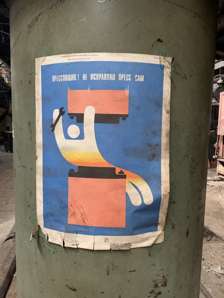 В обозначенную упорную работу включается и агитационный плакат. Отдельная тема для плаката на рабочем месте – неукоснительное соблюдение техники безопасности. Здесь нет места ликованию трудовыми успехами или изображению подвига советского народа. Единственная цель – шокировать зрителя. Один взгляд должен вогнать в мозг и память как сам пункт техники безопасности, так и катастрофические последствия его невыполнения. Говорят, что инструкции по техники безопасности написаны кровью, поэтому здесь кровь либо на видном месте, либо её символизирует тяжёлый цвет фона.
