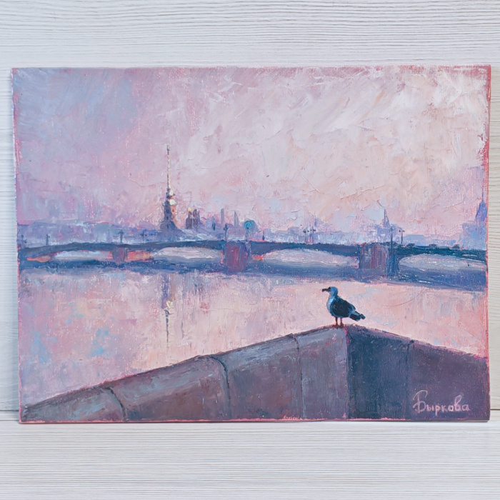 Привет! За окном сейчас дождь и небо серое. Я решила поделиться работой, где как раз пыталась побороть петербургское серое небо и попасть в нужный оттенок цвета. Не так просто как оказалось! На картине (этюде, если точнее, учитывая размер) утро перед самым рассветом летом, обычно в жаркую и ветреную погоду. Сперва решила сделать светло-красный подмалевок, чтобы остальные цвета как бы проступали через него, остальные цвета уже сверху накладывала мастихином. Хотелось создать ощущение того, что ночной туман у воды сейчас вот-вот рассеется, и на первый план выйдет яркий розовый рассвет. А затем по мосту загудят машины, и город вновь вернётся к привычному ритму. Несколько фото крупным планом. Как и на прошлой работе чайку надо было нарисовать просто обязательно! Подписаться на Пикабу Познавательный. и Пикабу: Истории из жизни.