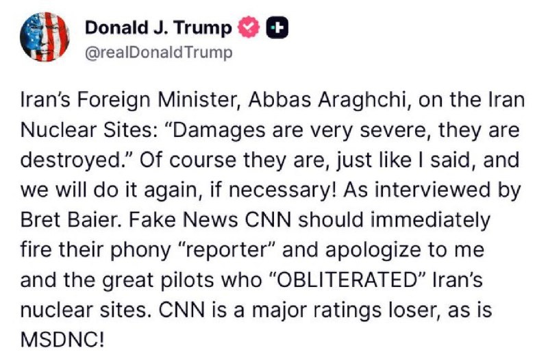 В ответ на пост Trump is ready to strike Iran AGAIN: ‘We will do it again, if necessary... Fake News CNN should immediately fire their phony “reporter” and apologize to me’ CNN is a major ratings loser, as is MSDNC!