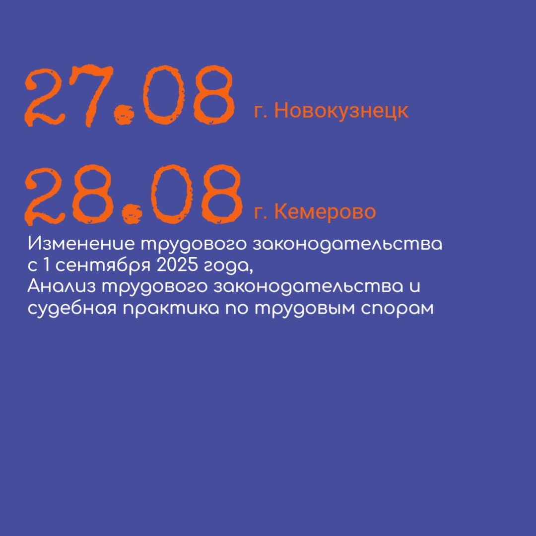 📣 Семинар «Изменение трудового законодательства с 1 сентября 2025 года, Анализ трудового законодательства и судебная практика по трудовым спорам» 📅Дата: 27 августа (г. Новокузнецк) 28 августа (г. Кемерово) 🕒Время:10:00–16:00(местное время) 👩Эксперт: Карасева Елена Витольтовна (г. Новосибирск) • Ведущий специалист по вопросам трудового права и кадрового делопроизводства, • Практикующий юрист - более 15 лет в сфере трудового права, • Директор ООО «Агентство трудовых споров», • Большой опыт публичных выступлений (для коммерческих и муниципальных предприятий по вопросам практики применения норм трудового права с учётом существующих изменений в ТК РФ). 📌Кому будет полезно: • юристам, • начальникам отдела кадров, • специалистам по кадрам, • главным бухгалтерам • и всем заинтересованным лицам. В 2025 году работодателю нужно учесть ряд масштабных изменений в трудовом законодательстве: новые правила бронирования работников, требования по компенсации выходных дней при увольнен