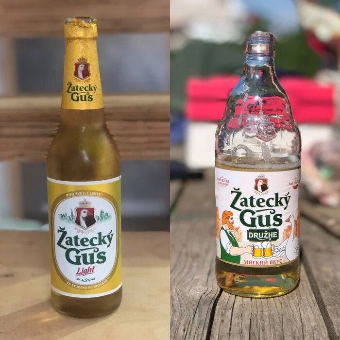 Бутылка у Лайта скромная, без изысков. Дизайн этикетки весьма аскетичен: старый традиционный Гусь. А вот у Дружного все с точностью наоборот - бутылка необычной формы и этикетка с забавным артом. Внимание привлекает больше.