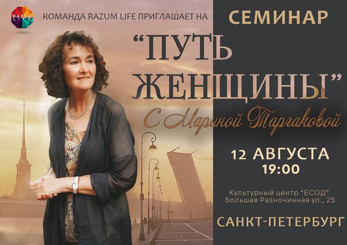 🎉🎉Дорогие друзья! Рады пригласить вас на уникальное событие в нашем городе: Только ‼️12 АВГУСТА‼️ В Санкт-Петербурге Марина Таргакова с авторским семинаром " П У Т Ь Ж Е Н Щ И Н Ы " ✔️В чем заключается женское предназначение? ✔️Как сохранить любовь и верность в семье? ✔️Одиночество в семье и без… ✔️Что такое женское счастье? ✔️Возможно ли оно, если нет мужа, детей? ✔️Свекровь и невестка: секреты взаимопонимания ✔️Материнство и быт: как не потерять себя и открыть новые возможности для самореализации 📌 Вас ждёт незабываемая теплая, дружеская атмосфера общения с автором, возможность приобрести книгу Марины Таргаковой, а также другие приятные сюрпризы! 📍Место проведения: Культурный центр "ЕСОД" Большая Разночинная ул., 25 🕑Время проведения: с 19:00 до 21:00. ▶️ Покупка билетов по ссылке: https://cbiletom.ru/event.php?event=10730 Заказывайте билеты, приходите на семинар, зовите с собой близких, друзей и знакомых! 👫👭 📞 +79219483848 Мария Ждем вас!