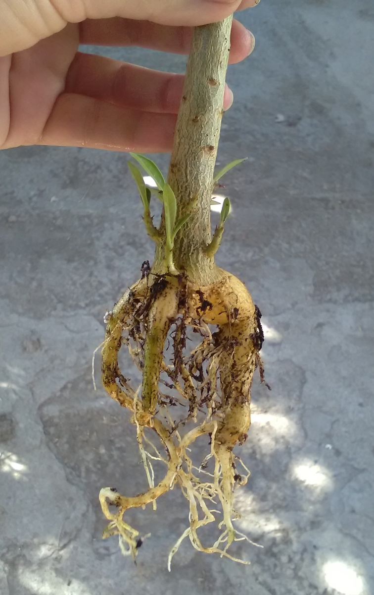 Ну что, готовы раскрыть подземные тайны? Сегодня я всё таки не сдержалась и распотрошила череночек арабикума. Хотя собиралась это сделать попозже, ближе к осени, но куда там!.. Если мысль уже засела, то покоя не жди. Так было интересно, что же там скрывается... И, скажу я вам, ожидания обмануты не были. Посмотрите только, какие корешки! Совсем неплохо для черенка. Особенно один из корней, самый толстый, толщиной с сам черенок. Остальные потоньше, но мне нравится, как они расположены: довольно симметрично, по всей окружности. Конечно, араб и в этом араб: у обессума черенок вряд ли смог бы нарастить такие корни за это же время. Немножко почистила ему шевелюру, обрезала тонкие корешки на верхней части основных корней. Естественно, сам черенок хоть и будет со временем увеличиваться в диаметре, но в каудекс не превратится. Зато у корней хорошая перспектива растолстеть. При последующих пересадках можно будет постепенно приподнимать черенок так, чтобы корни были видны, и вот вам отличная