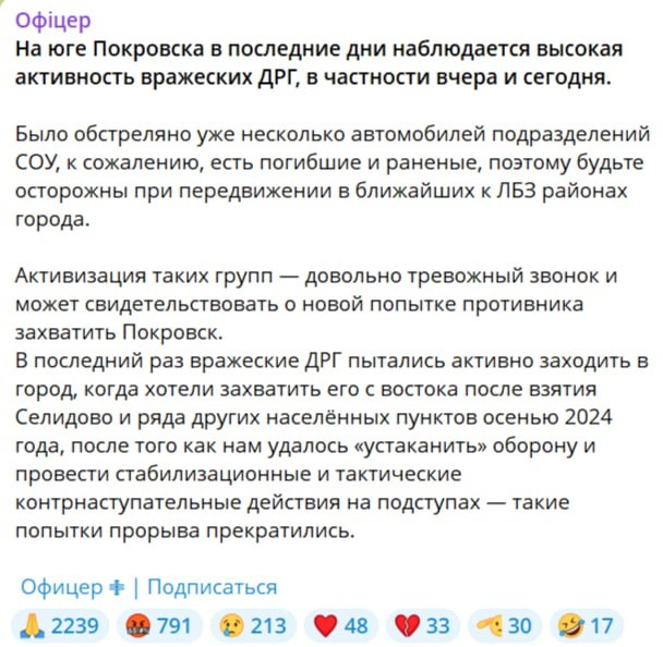 Наши ДРГ в Покровске. Первое видео от лица ВСУшников в машине, второе видео - это добивание остановленной машины. На скрине укро-военблогер жалуется на ДРГ в Покровске. ДРГ действительно вполне могут просочиться в город, так как до ЛБС около 4-5 км и сплошной обороны у ВСУ нет, есть опорные пункты. Покровско-мирноградская агломерация около 100 тысяч человек, до войны. Если ее удастся освободить, то это будет второй крупный успех российской армии, после освобождения Мариуполя, довоенное население которого составляло 420 тысяч человек.