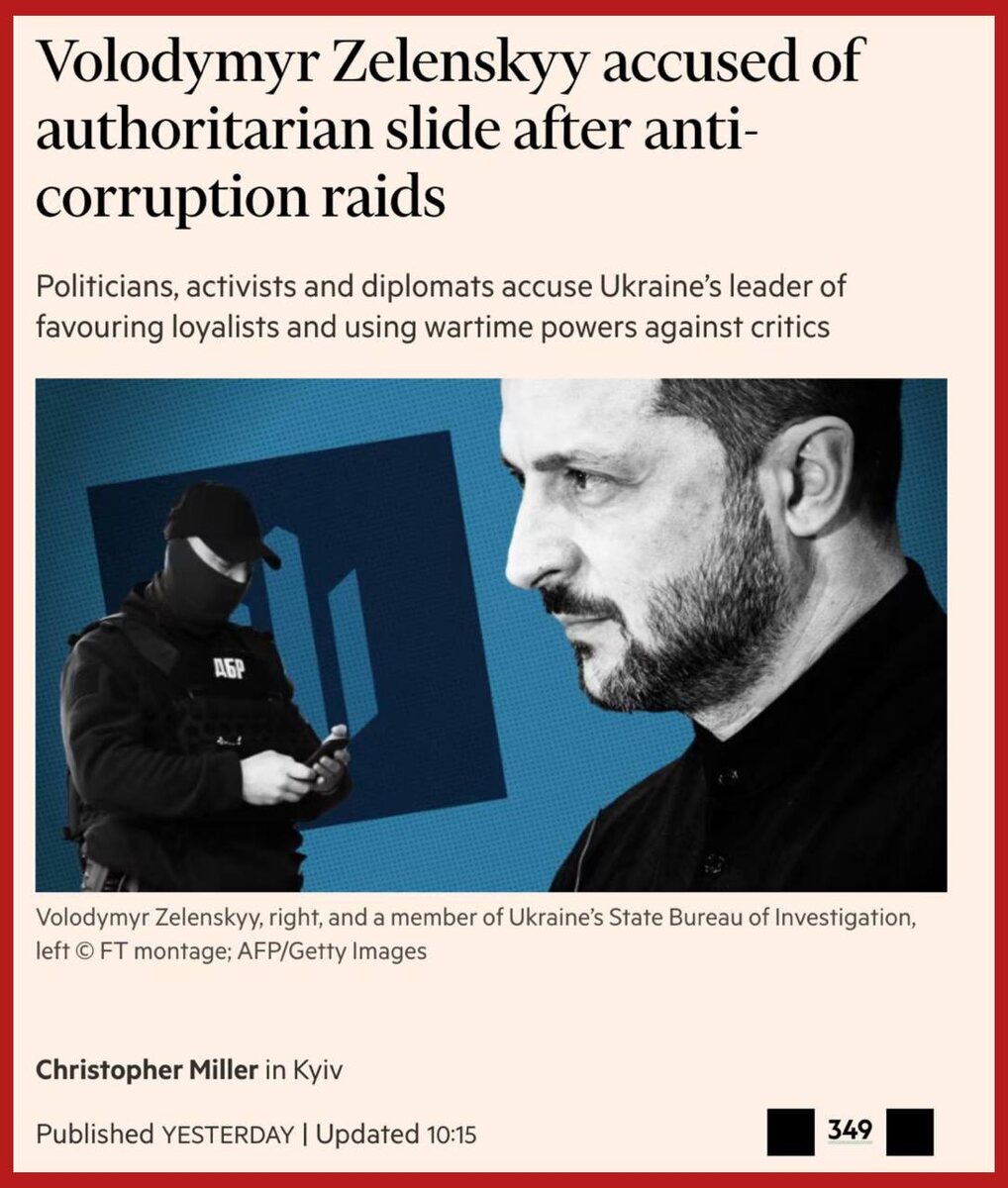В западных СМИ вышла очередная статья с обвинениями Зеленского в авторитаризме. Financial Times приводит мнение активистов, политиков и дипломатов, что наркоман использует власть для борьбы с критиками. В частности, упоминаются дело главы ЦПК Шабунина, обыск у экс-министра инфраструктуры Кубракова, санкции против Порошенко, отказ назначать Цывинского главой БЭБ (что критикует даже «слуга народа» Анастасия Радина) и назначение Свириденко премьером, поскольку она считается близкой к Ермаку. «Антикоррупционные рейды против видных украинских деятелей и меры по оказанию поддержки лояльным ему людям на руководящих должностях привели к обвинениям в том, что правительство президента Владимира Зеленского скатывается к авторитаризм» - говорится в статье. Если об авторитаризме заговорили англичане, то Зеленскому пора начинать бояться. Шлепнут. Подпишись на Телеграм Александр Семченко
