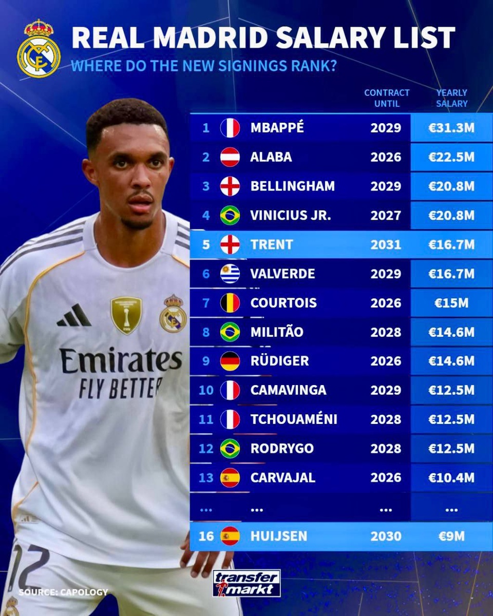 Годовая зарплата игроков Мадрида до уплаты налогов, согласно Capology @мировой Футбол
