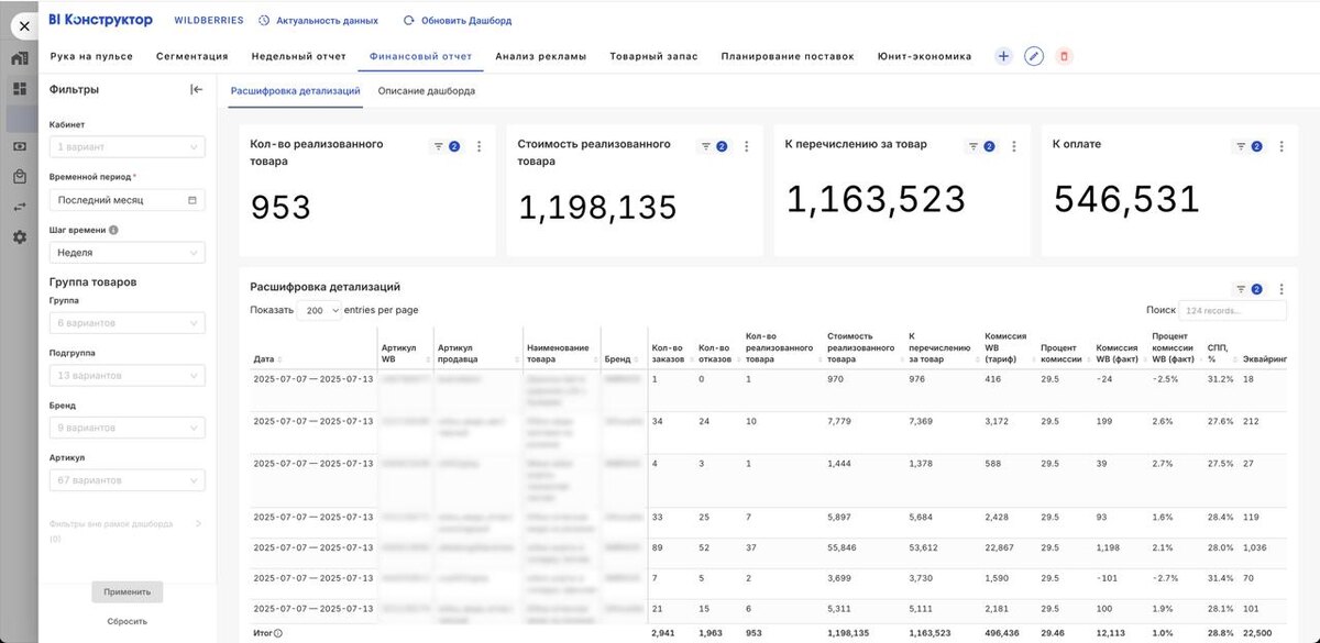 🧠 Главный инсайт после запуска аналитики для селлеров Когда разрабатывали mongers.io думал, что селлерам хочется сбежать из Excel. Он неудобный, тормозит на больших объёмах, формулы слетают. Казалось, BI-платформа должна заменить его полностью. Но я ошибался. 📊 Визуализации в BI хороши для одного: чтобы быстро понять картину, увидеть тренды, аномалии, объяснить другим. Но к сожалению таблицы в BI реализованы слабо и реальной работы без таблиц не бывает. Селлерам нужны таблицы. Не вместо Excel, а вместо сломанного Excel. Им важны: ✅ стабильность; ✅ достоверность; ✅ возможность работать с большими объёмами данных без страха всё уронить; 🔧 И это решается: таблица в вебе, но нормальная. С фильтрами, сортировками, подсветкой, закреплением колонок и экспортом. 📌 Итог Базовая мощная таблица + визуализации на её основе – вот идеальный рабочий инструмент для селлера. 🚀 Начинаем с разработки первой таблицы – Финансовый отчёт. В основе – API Wildberries, раздел «Отчёт о продажах по реа
