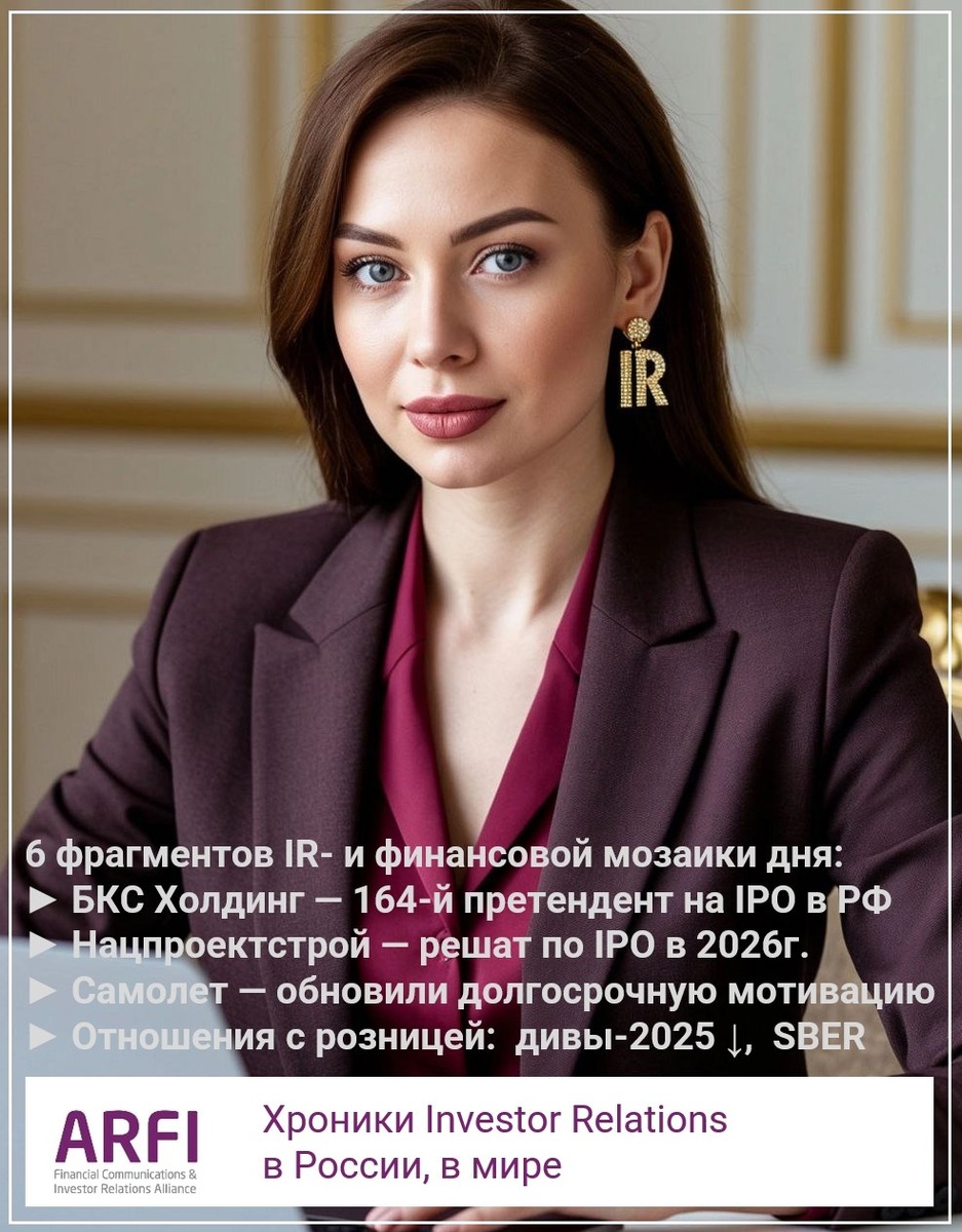 Утренний IR-дайджест 22.07.2025 ► БКС Холдинг [IPO 2026?] — основатель БКС О. Михасенко продал 99,99% "БКС Холдинга" директору В.Шелиховскому, который стал основным акционером 18 июля. 0,1% капитала Группы принадлежит Наталье Михасенко. Изменения связаны с планами выхода на IPO в 2026 году. Структура собственности меняется в интересах инвесторов, а система корпоративного управления остаётся на высоком уровне. О. Михасенко сосредоточится на управлении международным бизнесом. (Интерфакс) ► Нацпроектстрой (группа «1520») [IPO 2027?] — намерены разместить облигации и определятся позицией по IPO до конца 2026г. Глава компании А. Крапивин не раскрыл оценку бизнеса и детали IPO, подчеркнув проведение аудита крупной компанией и уверенный взгляд на создание успешной и дорогой компании. Первым этапом станет выпуск цифровых финансовых активов объемом ₽2 млрд с доходностью 24,25% годовых для неквалифицированных инвесторов. (Интерфакс) ► Группа Самолет [SMLT] — СД утвердил новую программу долгос
