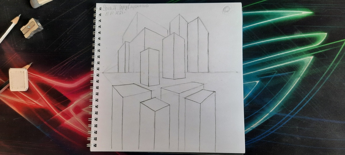 В двадцать пятом уроке мы рисуем город, не одну улицу, как это было в одном из прошлых уроков, а с двумя точками схода и полноценными многоэтажными домами. Изначально нужно нарисовать горизонт и две точки схода и постепенно рисуя по одному домику, но я так увлекся процессом, что забыл запечатлеть начальный или хотя бы средний этап домов. Поэтому показываю этап домов, без теней. Я думаю, что по линиям оставшимся, понятен процес. Ну а далее затеняем и растушевываем :) И получаем такой результат: Следующий, двадцать шестой урок, предлагает выполнить написание 3Д текста. Кириллические буквы я не стал использовать, а взял простое слова HI из примера. Находим центр, где будут заканчиваться слово и рисуе