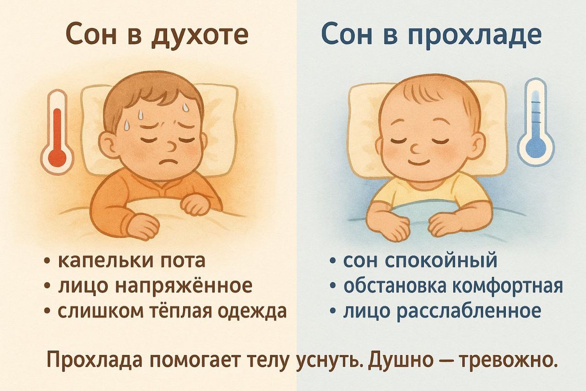 🌙 Прохладно? Это хорошо! Многие мамы тревожатся: «А не замёрзнет ли он?..» «А вдруг ему холодно, поэтому он плохо спит?» ⠀ И включают обогреватель, надевают второй носок, укутывают поплотнее. ⠀ Но знаешь что? Малыш не мёрзнет. Он… перегревается. И вот это-то как раз и мешает спать. --- 🛏 Оптимальная температура для сна — +18…22°C, с хорошей влажностью (40–60%). ⠀ Это не только про комфорт. Это про безопасность. В прохладе: — малышу легче засыпать — тело выделяет больше мелатонина — уменьшается риск СВДС (синдрома внезапной детской смерти) — и, между прочим, маме тоже спится лучше 😉 --- 🔥 А вот перегрев — враг сна Когда в комнате душно: — малыш просыпается чаще — ведёт себя беспокойно — может чаще прикладываться к груди — не от голода, а чтобы утолить жажду — появляется потливость, сыпь, капризы ⠀ Это не «плохой сон». Это сигнал: «Мне жарко». --- 💡 Что можно сделать? ✔ не бойся прохлады — бойся духоты ✔ проветривай комнату перед сном ✔ не кутай ✔ следи за влажностью (увл