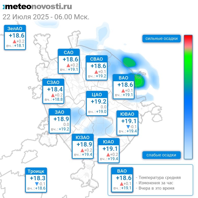 В 6:00 в Москве было от +17.7°C до +20.1°C, средняя температура +18.8°C #погода #Москва #лето #температура #22июля #вторник