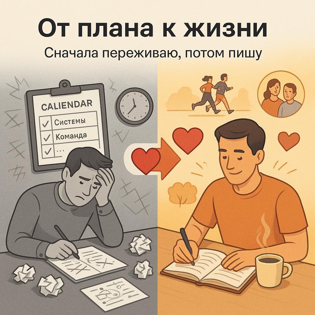 От контент-плана к дневнику: как я перестал придумывать и начал проживать 📝 Вчера получил первую обратную связь: "Андрей, твои посты стали лучше заходить. Чувствуется, что ты по-другому пишешь." И понял — да, действительно всё изменилось. 🗓️ Как было раньше: Сидел с контент-планом, придумывал темы на неделю вперёд. "Понедельник — про системы, вторник — про команду..." Мучился с заголовками, выжимал из себя "полезности". Искал клиентские кейсы, конструировал истории. К концу дня чувствовал себя как выжатый лимон. Писал не от души, а по плану. 📖 Как стало сейчас: Контент-план забросил. Посты теперь — следствие моей жизни. Логика простая: Событие → переживание → осознание → пост Пробежал 15 км с женой → увидел контраст наших состояний → понял про мастерство → написал. Застрял в дофаминовом откате → прожил это → поделился честно. Сначала переживаю, потом пишу. 💡 Главное открытие: Мои посты стали дневником. Публичным дневником. Это помогает зафиксировать то, что обычно пр