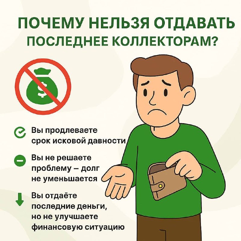 🚫 Почему нельзя отдавать последнее коллекторам? 💸 Когда долг растёт, а звонки коллекторов становятся ежедневным стрессом, возникает желание "откупиться хоть чем-то", лишь бы отстали. Но частичные платежи — не всегда помощь, а часто капкан. 🔁 Что происходит, когда вы платите хоть немного: 🔹Вы продлеваете срок исковой давности. С этого момента кредитор снова получает право подать в суд. 🔹Вы не решаете проблему — долг не уменьшается, а просто откладывается. 🔹Вы отдаёте последние деньги, но не улучшаете финансовую ситуацию — долги всё равно висят. 📉 В итоге: деньги потрачены, давление продолжается, а долг может ещё и вырасти. 💡 Лучше остановиться, перестать платить "для галочки" и оценить ситуацию трезво. Возможно, вам уже давно подходит процедура банкротства, и вы просто теряете время и деньги. 📩 Напишите нам в ФЦБ — разберём ваш случай и покажем, как выбраться из долгов без жертв и паники. @YAUROVA_ZAPIS_BOT 👈