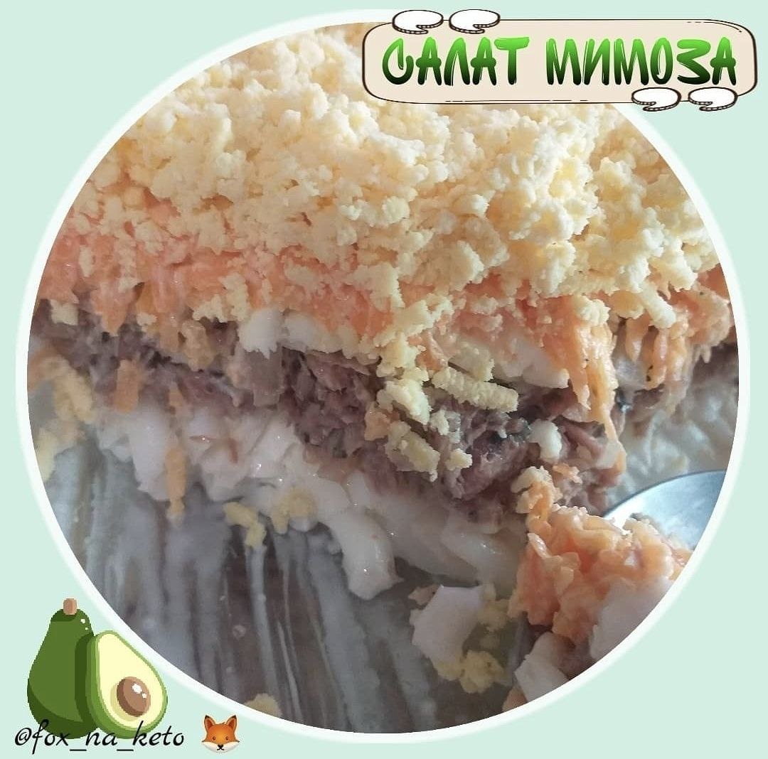 САЛАТ "МИМОЗА" Кто сказал, что без картошки не вкусно и не сытно? #кетомимоза ⠀ Ингредиенты: 📌 яйца варёные 5 шт 📌 морковь варёная небольшая 1 шт (на адаптации не добавлять) 📌 рыбные консервы натуральные 1 банка 📌 лук репчатый 1 шт (50-70 гр) 📌 масло сливочное 50 гр 📌 майонез домашний 2-3 ст.л. 📌 сыр твёрдый 80 гр 📌 соль, перец по вкусу ⠀ Приготовление: 1 слой - белки (на крупной терке)+майонез+соль, перец 2 слой - рыбные консервы (размять вилкой) 3 слой - лук (мелко нарезать). 4 слой - масло (замороженное трём на мелкой тёрке) 5 слой - сыр (на мелкой тёрке) 6 слой - морковь (на мелкой тёрке) +майонез+соль, перец 7 слой - желтки (на мелкой тёрке) ⠀ ПРИЯТНОГО АППЕТИТА 🍽
