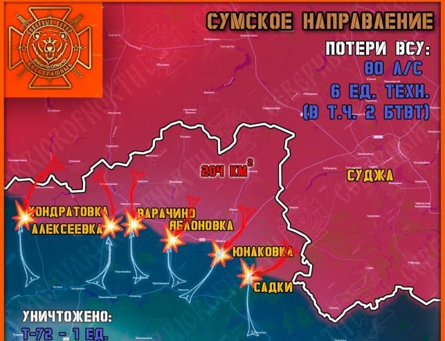 В группировке войск «Север» ВС РФ, которая держит рубежи у границы Глушковского района Курской области, продолжая расширять буферную полосу безопасности в Сумской и Харьковской областях Украины, рассказали о текущей обстановке на линии боестолкновений с ВСУ. За минувшие сутки 21 июля противник на Теткинском и Глушковском направлениях за счет переброшенных резервов возобновил попытки прорыва на нашу территорию. Штурмовые группы ВСУ пытались просочиться в Курскую область в районе Бессаловки и приграничного поселка Новый Путь. В результате комплексного огневого поражения, в том числе силами ВКС России, украинские подразделения были ликвидированы. На Сумском направлении продолжаются ожесточенные бои возле Кондратовки: ВСУ отправляют на убой штурмовые группы, которые перемалывают наши военные, по противнику активно работает российская авиация. Одновременно с этим, на других участках подразделения ВС РФ продвигаются вглубь территории Сумской области. В Варачино Северяне контролируют значител