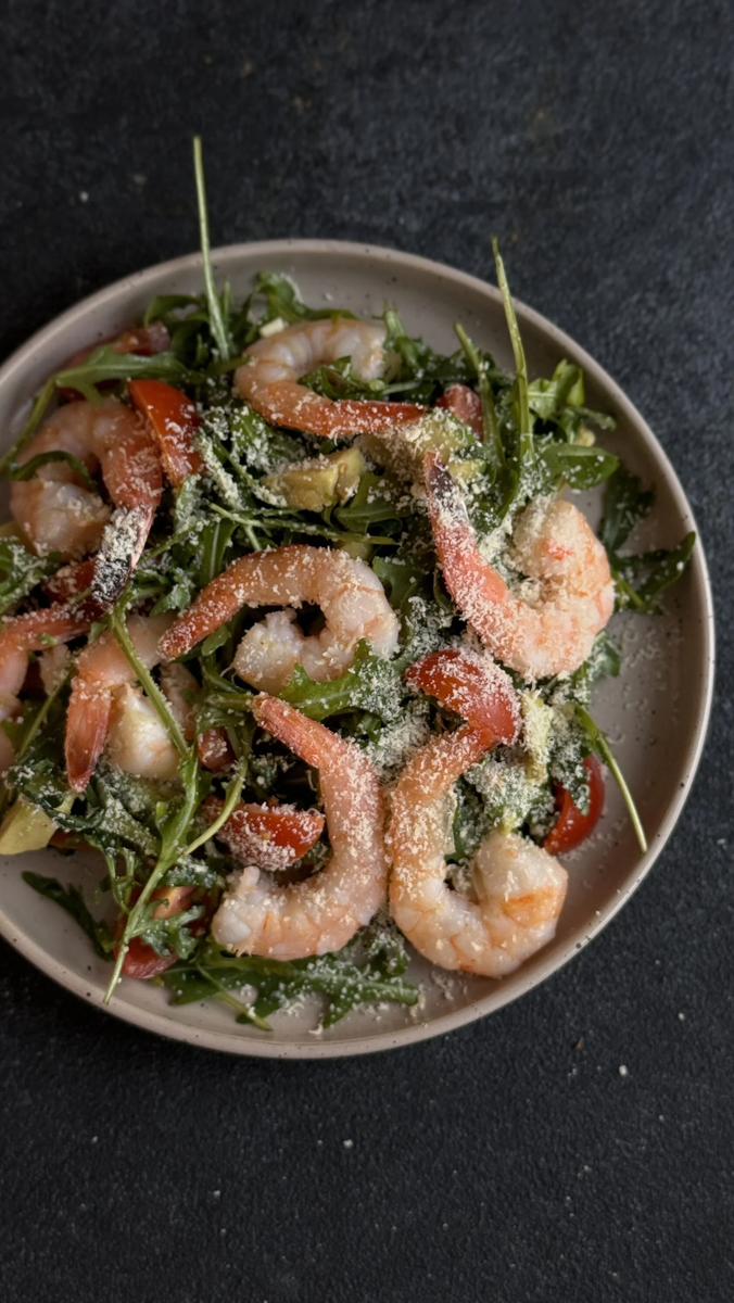 3. На тарелку выкладываем руколу, сверху авокадо, черри и креветки. Делаем заправку: соль, перец, оливковое масло. Трём сыр на мелкой терке. Готово!