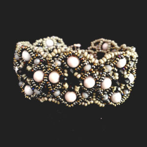 Вместо ронделей можно использовать круглые бусины Процесс плетения: https://youtu.be/7zloL213mtQ и https://rutube.ru/video/1920aa53529f392f0c7a44137ae650de/ Набрать 16 бисерин 10/0, сомкнуть в кольцо и пройти нитью через 4 первые бисерины Набрать 8 бисерин и сделать второе кольцо, нить вывести в 4 бисерины в середине нового кольца Набрать 12 бисерин и сделать третье кольцо, нить вывести в центральные четыре бисерины Снова набрать 8 бисерин, нить вывести через центральные 4 бисерины нового кольца Набрать 12 бисерин и сделать пятое кольцо, нить вывести сбоку Набрать 12 бисерин и сделать шестое кольцо, нить вывести в средние 4 бисерины Снова набрать 12 бисерин и сделать следующее кольцо, нить вывести в 4 бисерины на нижней части кольца Сплести кольца для второй части элемента аналогично первой части Соединить между собой нижние кольца. Нить вывести в середине нижнего центрального кольца Закрепить бусину 0,5 см. в нижнем центральном кольце. Закреплять, проводя через 2 бисерины с обоих сто