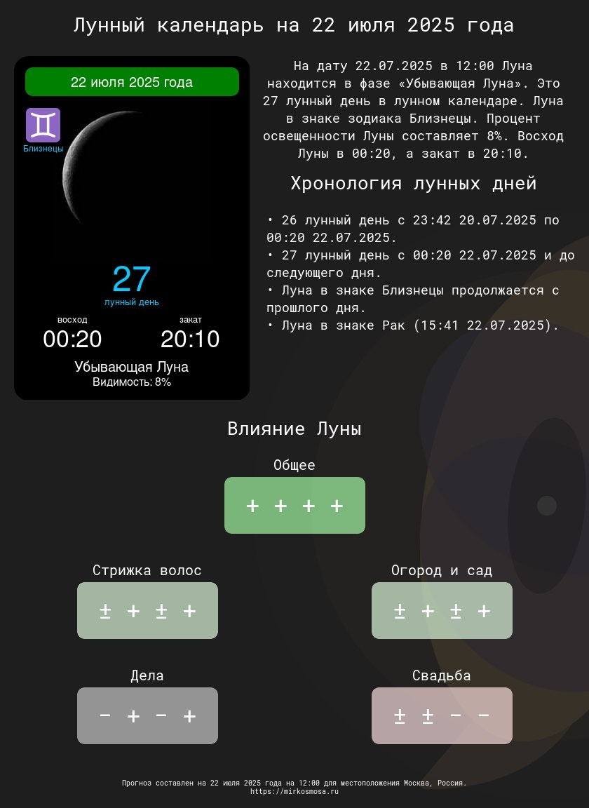 Лунные календари на 22 июля 2025 года: Подготовьтесь к этому дню с учетом влияния Луны! 🔹🌗 Лунный календарь на 22 июля 2025 года — Что приготовила Луна? Подробнее 🔹✂️ Лунный календарь стрижек на 22 июля 2025 года — Подходящий ли день для обновления прически? Подробнее 🔹🌱 Лунный календарь огородника и садовода на 22 июля 2025 года — Лучшее время для ухода за растениями. Подробнее 🔹📅 Лунный календарь дел на 22 июля 2025 года — Удачные моменты для важных задач. Подробнее 🔹💍 Лунный календарь свадеб на 22 июля 2025 года — Подходит ли этот день для вашего торжества? Подробнее