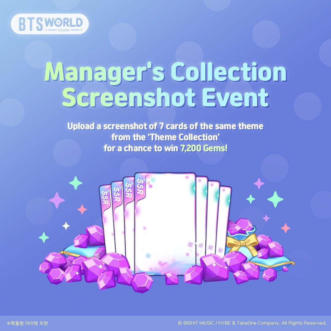 🍊 BTS World Season 2 в X: 🗃️ Событие скриншота коллекции менеджера. Менеджеры, всей душой любящие собирать карты, – 🚨 это для вас! 🚨 Если вы собрали 7 карт одной тематической SSR-коллекции, покажите их в X вместе с хештегами акции: BTSWORLD_Season2 Managers_Collection 15 менеджеров будут выбраны случайным образом и получат 💎 7200 алмазов 💎 📅 Период проведения акции: до 28.07 03:59 - Москва, Украина, Беларусь 05:59 - Казахстан, Узбекистан 📌 Подробнее 🎮 Скачать игру #BTSWorld @kumihobts