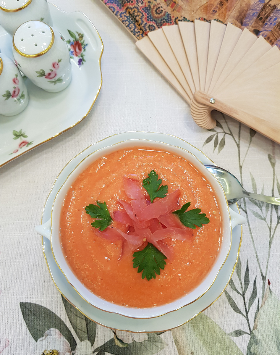 Добрый день, дорогие друзья! Сегодня в Сибири с самого утра жаркое лето, и поэтому я предлагаю приготовить холодный суп-пюре родом из испанской Андалусии, состоящий из небольшого набора продуктов. Для приготовления нам понадобятся: помидоры 1 килограмм, оливковое масло 60 грамм, батон 200 грамм, чеснок 7 грамм, соль 2 грамма, сыровяленая свинина 100 грамм, зелень петрушки. Приготовление: помидоры надрезать крест-накрест и залить кипятком на 5 минут. Батон нарезать кубиками. С помидоров снять кожицу. Нарезать томаты кусочками и положить в чашу измельчителя. Добавить нарезанный кусочками чеснок. Измельчить помидоры с чесноком до однородности. Высыпать в чашу блендера батон. Утопить кусочки батона в томатах и подождать 5 минут, пока батон пропитается томатным соком, а после этого измельчить. Добавить оливковое масло и перемешать. Разложить суп-пюре по бульонницам. Нарезать тонкими ломтиками свинину. Выложить в бульонницы листья свежей петрушки и ломтики свинины. Приятного аппетита!