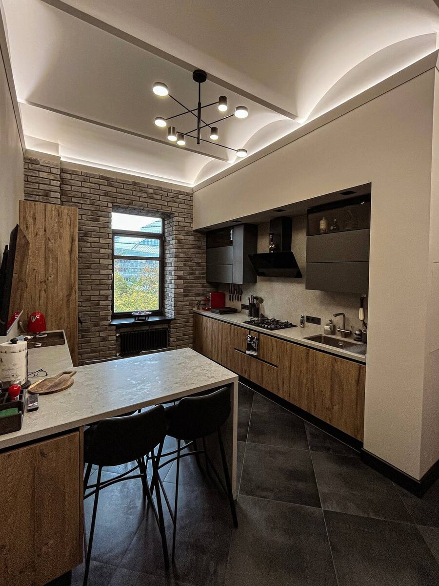На фото – душа и сердце квартиры: ее невероятно стильная и функциональная кухня. Мы воплотили в жизнь дизайн, который идеально сочетает в себе эстетику, комфорт и практичность. Что особенного в этой кухне? ✔️Современный лофт-шик: Акцентная стена из состаренного кирпича придает пространству характер и теплоту, в то время как гладкие фасады и минималистичная фурнитура подчеркивают современность. ✔️Продуманная эргономика: Каждый сантиметр использован максимально эффективно. Удобная рабочая зона, интегрированная техника и вместительные системы хранения делают процесс приготовления пищи удовольствием. ✔️Уникальное освещение: Многоуровневый потолок со скрытой LED-подсветкой и стильная люстра создают уютную атмосферу и визуально расширяют пространство, добавляя ему объема. ✔️Зона для завтраков и встреч: Остров с барной стойкой – идеальное место для утреннего кофе или душевных бесед с близкими. Этот проект – яркий пример того, как комплексный подход к ремонту позволяет создать единое, гармон