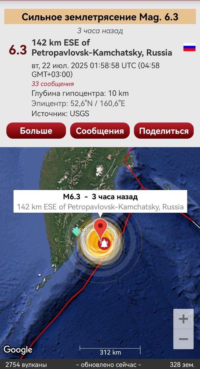 Согласно вчерашнему предупреждению к востоку от Камчатки произошел ощутимый афтершок М6.3