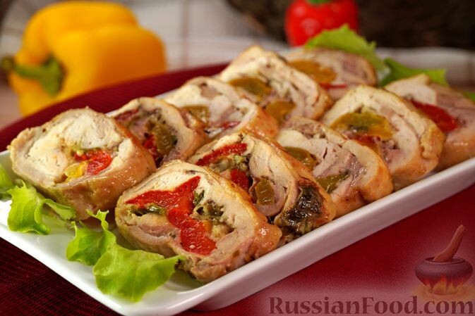 Куриный рулет с запечённым перцем и сыром. Нежное куриное мясо, свёрнутое в рулет и пропитанное ароматом запечённого болгарского перца, свежей зелени и расплавленного сыра, остаётся сочным и вкусным даже в холодном виде. Это аппетитное блюдо с яркой начинкой и насыщенным вкусом украсит любой праздничный стол.