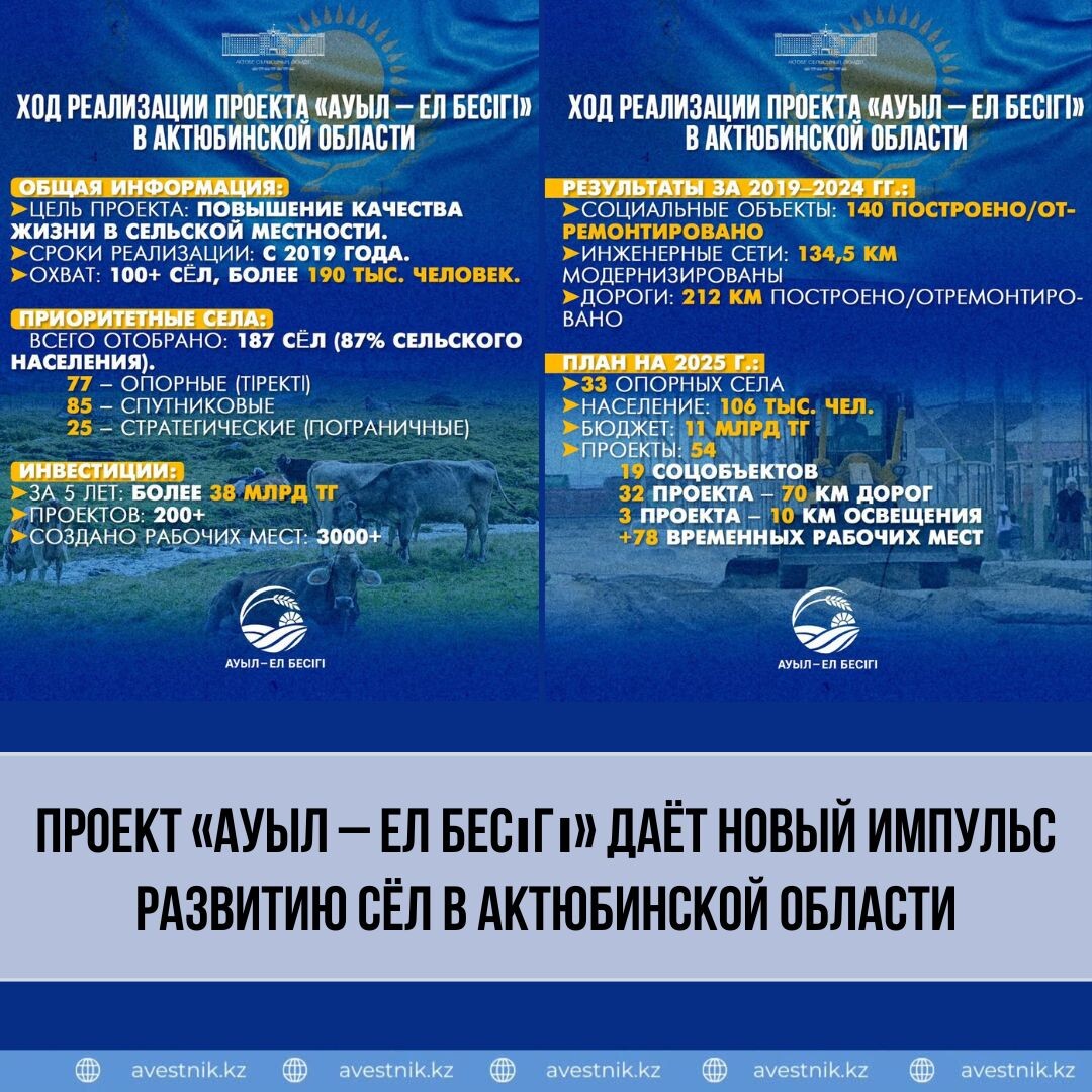 ✨ С 2019 года улучшена инфраструктура и обновлены социальные объекты в более чем 100 сёлах, где проживают около 190 тысяч человек. 🔧 За 5 лет реализовано свыше 200 проектов, создано более 3 тысяч новых рабочих мест. 📅 В этом году в 33 опорных сёлах планируется реализовать 54 проекта на сумму 11 млрд тенге. В их числе — школы, детсады, дороги, уличное освещение и другие важные объекты. 🏞️ Село — основа страны. Работы в рамках проекта продолжаются. ✍️ Акимат Актюбинской области 📖 Читайте на сайте 🌐avestnik.kz #инфраструктура #селоразвивается #рабочиеместа #образование #дороги