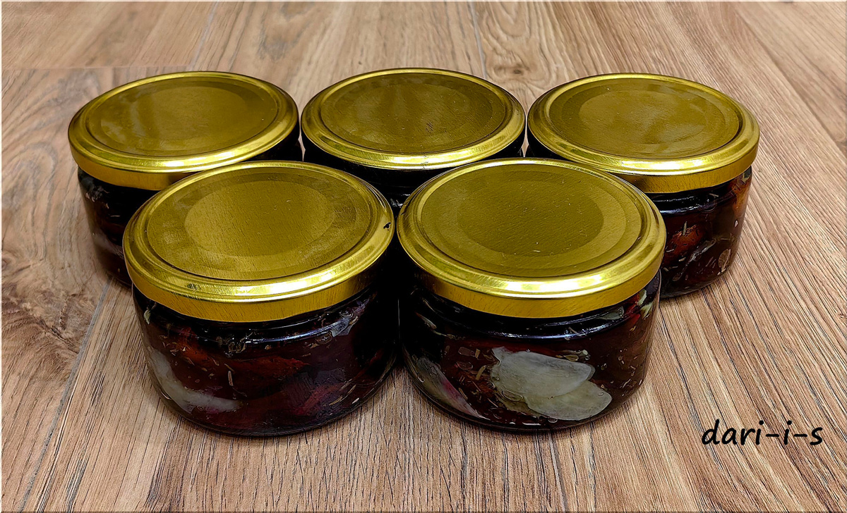 Заливаем горячим, но не кипящим, оливковым маслом. Закручиваем. Укутываем до остывания. Банки можно не стерилизовать перед закладкой продуктов, но я перестраховываюсь и всё-таки стерилизую в духовке. Готово.