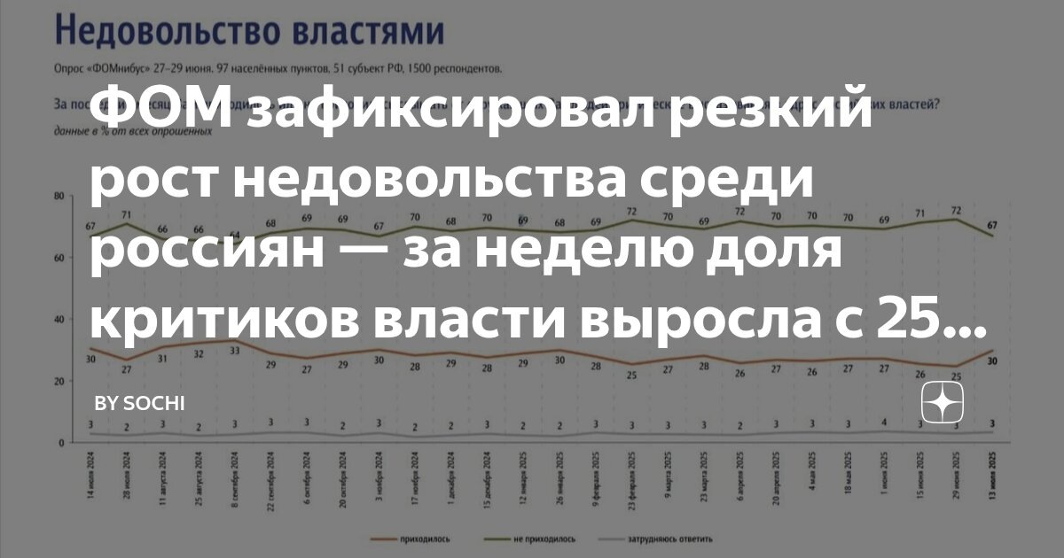 Смотрите, какая новость у нас от вчера и сегодня: Нет, это не я так думаю, я еще хуже думаю. А, это, вполне официальная информация от ФОМ. Как пишет ФОМ – количество недовольных россиян выросло на 5%. Было 25%, а стало… Так! Падаждите! Мы же каждую пятницу видим отчет того же ФОМа, что доверяющих и одобряющих 80% и даже плюс. Плюс пару процентов дорогих и очень странных россиян, которые то доверяют, но не одобряют, то наоборот. Но, если недовольных было 25% то, как они получали 80% одобрямс? Опять новые физические принципы и креативная математика? Ладно. Посмотрим, по каким причинам клуб «Недовольных» пополнился сразу на 5% за какую-то неделю июля. СМИ: К традиционным моментам добавились те, которых ранее в нашей жизни не было. Твоюдивизию. У нас оказывается были традиционные моменты недовольства. Ну слава те Господи, что хоть традиционные, а не наоборот. Дальше СМИ: Что больше всего не нравится жителям России: Рост тарифов ЖКХ, Инфляция, Атаки БПЛА на города, Ограничения на перелёты (