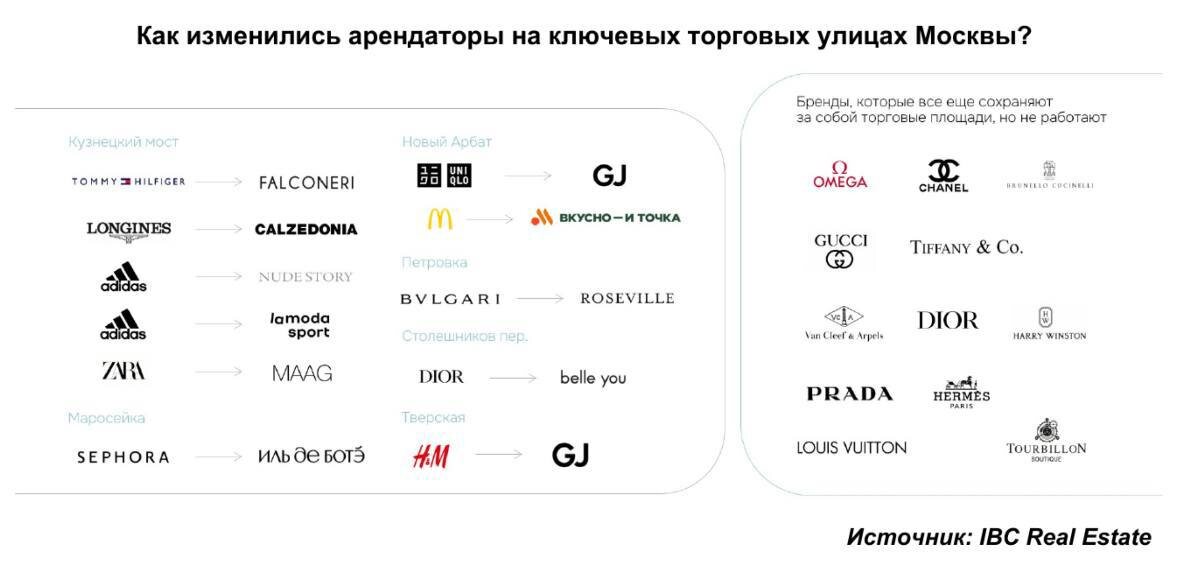 По данным аналитиков IBC Real Estate, ситуация на главных торговых улицах Москвы демонстрирует определённые изменения. Доля свободных торговых площадей достигла максимального значения в 2,3%. Значительное число международных брендов временно прекратило работу: 29 торговых точек приостановили деятельность, сохранив при этом свои витрины и вывески. На текущий момент (июль 2025) ситуация следующая: * 12 точек остаются приостановленными; * 6 помещений вакантны; * 11 объектов заняты новыми арендаторами. Особенно заметны изменения в сегменте люксовых брендов. До 2022 года они концентрировались преимущественно на Петровке и в Столешниковом переулке. В 2025 году их доля на этих улицах составляет 36%, что на 11 процентных пунктов меньше по сравнению с 2021 годом (**47%**). В 2021 году здесь работало 43 люксовых ритейлера, среди которых были такие бренды, как Brunello Cucinelli, Vacheron Constantin и Richard Mille. 👉Следите за новостями на нашем канале: @Commers_Estate ✔️Реализуйте свою нед