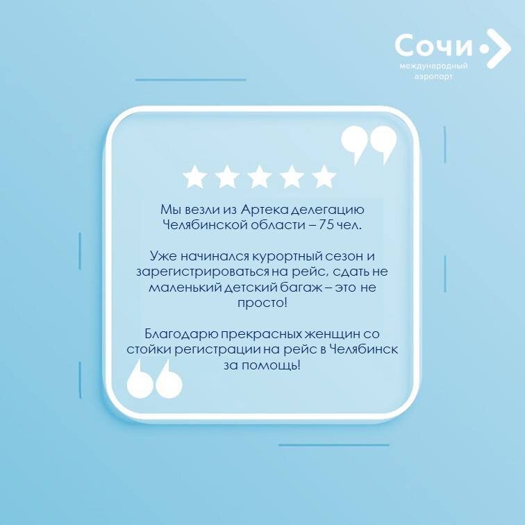 ➡️Сотрудники аэропорта Сочи подарили детям из «Артека» комфорт и заботу 🩵 👏Кандидат педагогических наук Николай Дерягин, который перевозил детскую группу из «Артека», высоко оценил работу сотрудников первой смены, отметив их профессионализм, отзывчивость и внимательное отношение. 👧По прибытию группы детей из детского лагеря «Артек», сотрудники аэропорта открыли отдельную стойку регистрации, выделили специальную линию досмотра и посадки на борт, что сделало их пребывание в воздушной гавани юга комфортным и приятным. 💐Благодарим за работу наших коллег из службы организации перевозок- Анастасию Широкову и Ксению Данилову, а также сотрудников службы транспортной безопасности - Викторию Пономареву и Наталью Петрову. Мы гордимся нашим коллективом и благодарим сотрудников за отзывчивость и высокий уровень сервиса. Ваши усилия делают наш аэропорт особенным для каждого пассажира! 🩵