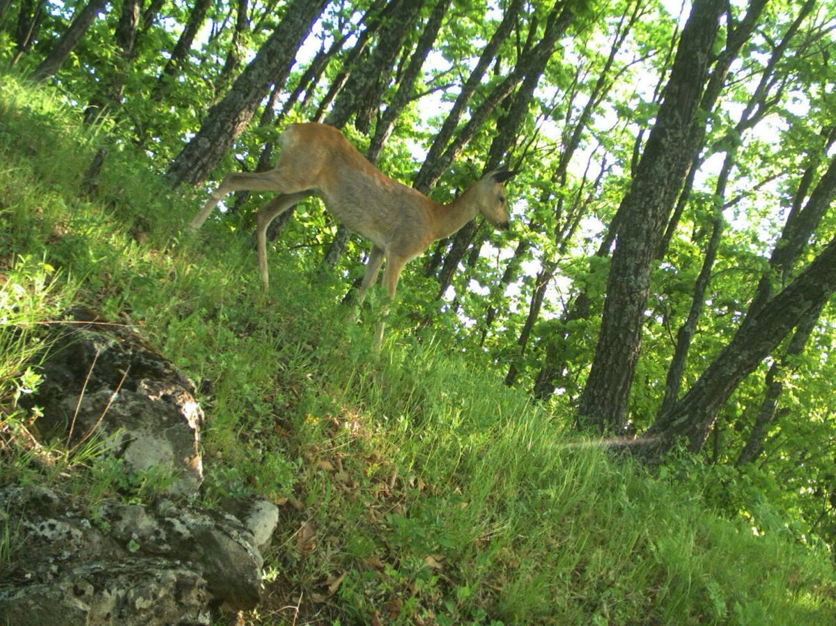 Эта косуля могла идти по ровной местности, но, вероятно, из-за ветра или какого-либо обитателя «Земли леопарда» она уже спускается с крутого склона 🦌 На «Земле леопарда» более 450 фотоловушек, и иногда непредвиденные обстоятельства меняют их ракурс. К счастью, такие обстоятельства никак не мешают нашим учёным продолжать наблюдать за животными и их повадками. Говоря о косуле, кажется, она устроила трапезу. Летом эти копытные в основном питаются травой, побегами, ягодами, грибами, а также любят жёлуди. 🐆 Здесь «Земля леопарда»