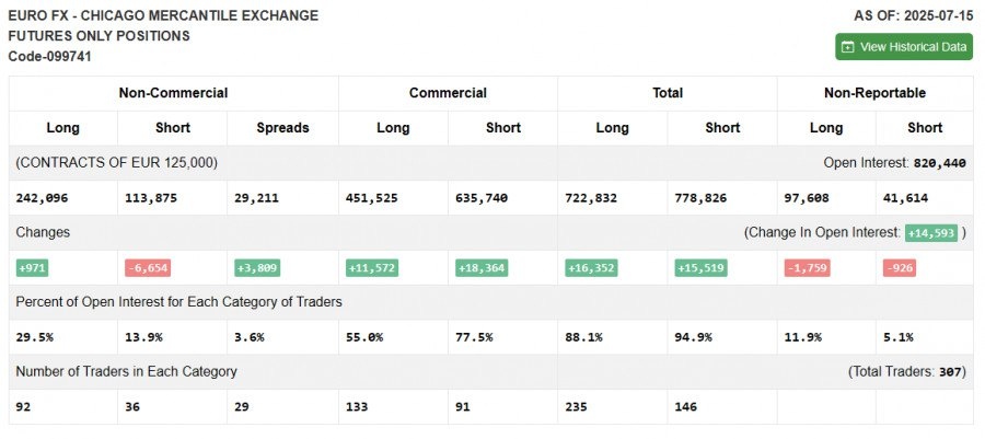 Прежде чем говорить о дальнейших перспективах движения EUR/USD давайте посмотрим, что происходило на фьючерсном рынке и как изменились позиции Commitment of Traders. В COT-отчете (Commitment of Traders) за 15 июля наблюдался рост длинных позиций и резкое сокращение коротких. Продавцов евро стало намного меньше и это можно объяснить ожиданиями паузы в цикле снижения процентных ставок…