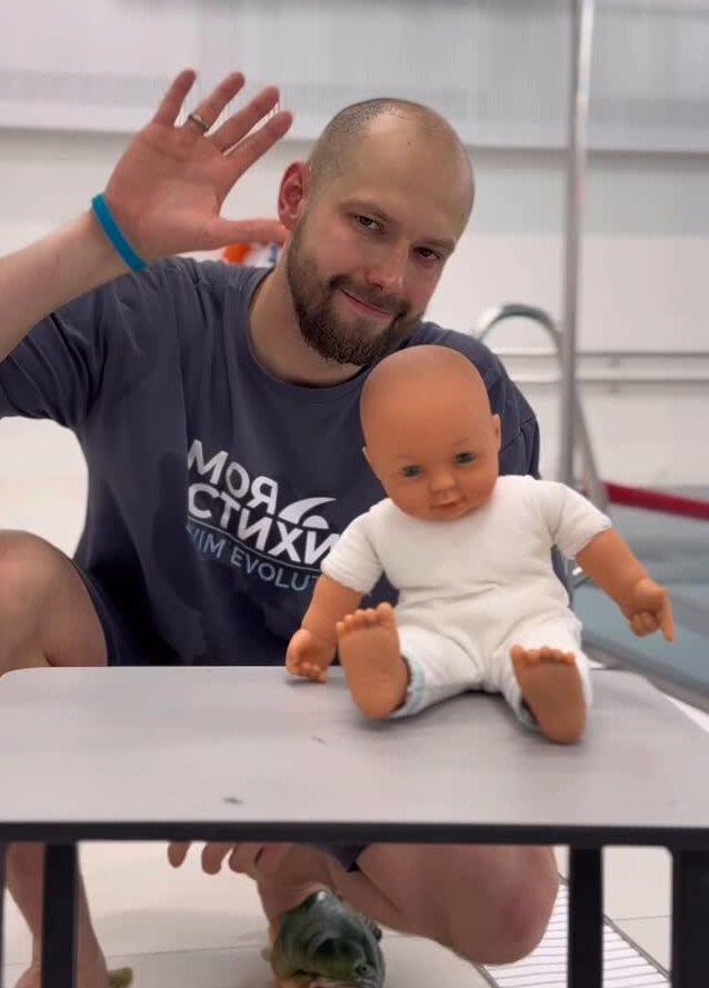 Вам наверняка попадались его веселые видео: харизматичный тренер-зажигалка, у которого есть подход к каждому ребенку. Его занятия вызывают у маленьких учеников восторг и желание прыгать/нырять/плыть.