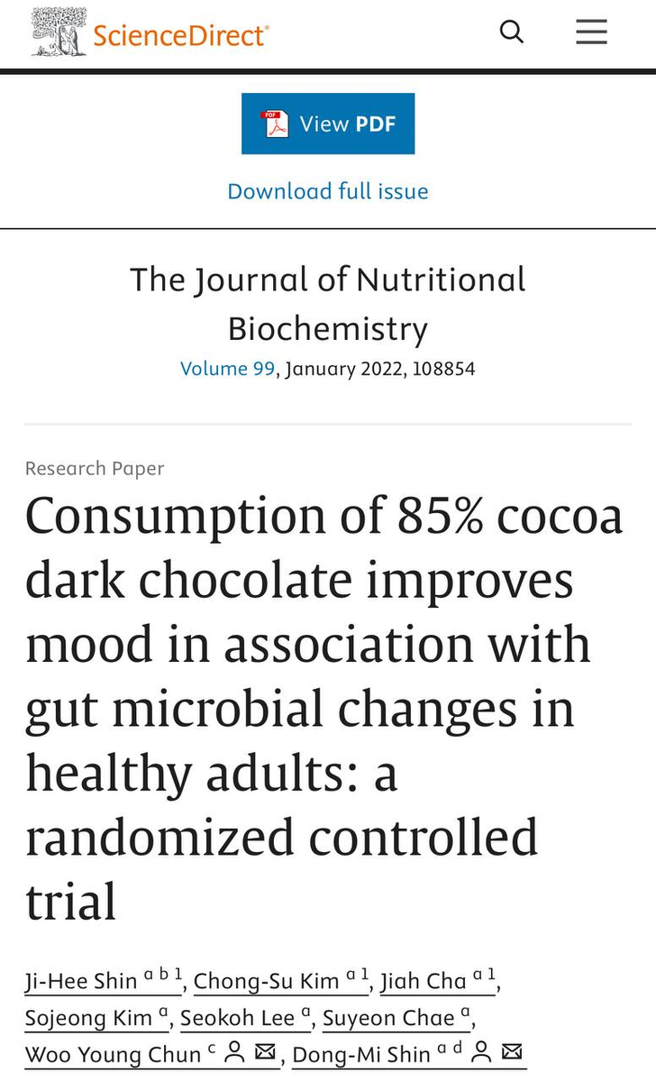 О психологии легко, интересно и с юмором 🌟 Переходи по ссылке 💫 Новое исследование показало: ежедневная порция 85% тёмного шоколада (30 г) может реально улучшать настроение через ось кишечник-мозг. Всё дело в том, как он положительно влияет на микробиоту кишечника, а через неё и на мозг. Спустя три недели исследования участники отметили, что значительно реже сталкиваются с эпизодами стресса, раздражительности и плохого настроения. 📌 Почему это происходит❓ 🔹Полифенолы темного шоколада действуют как пребиотики, питая полезные бактерии кишечника. 🔹В шоколаде с содержанием какао 85% - 400 мг полифенолов. При 70% - всего 250 мг. 🔹 Именно эта разница в 150 мг определяет, почувствуете ли вы улучшение настроения. 🔹Изменения связаны с ростом полезных бактерий, особенно Blautia obeum, которые участвуют в регуляции эмоций. 🧠 Почему это интересно❓ Наш кишечник напрямую связан с мозгом, и то, чем мы его кормим, влияет на настроение. Полифенолы какао - отличная еда для «правильных» бактери