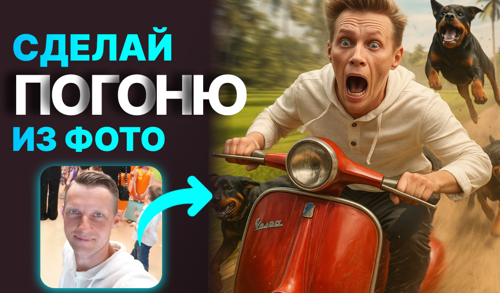 1. Открываете телеграм-бот syntxaibot 2. Меню\Дизайн с ИИ\Sora images 3. Загружаете туда свое фото 4. Вставляете промпт (запрос к нейросети) Вам будет доступна одна бесплатная генерация. Либо вы можете использовать любую другую нейросеть для генерации изображений. Create a humorous, cinematic image of a person from attaching photo, riding a red vintage Vespa scooter at high speed on a dirt road surrounded by green rice fields and palm trees. The person looks extremely shocked and scares, with their hair back from the wind and eyes wide open, hair short as in the attached photo, while being chased by three aggressive dogs running behind them, Rottweiler dog breed. One of the dogs is leaping mid-air with its mouth open. The scene is full of motion blur and dust to emphasize the speed and urgency. The scooter is tilting slightly, and the person’s clothes are flapping in the wind. Make facial features as similar as possible to the attached photo and try to smooth out the wrinkles. Автор ст