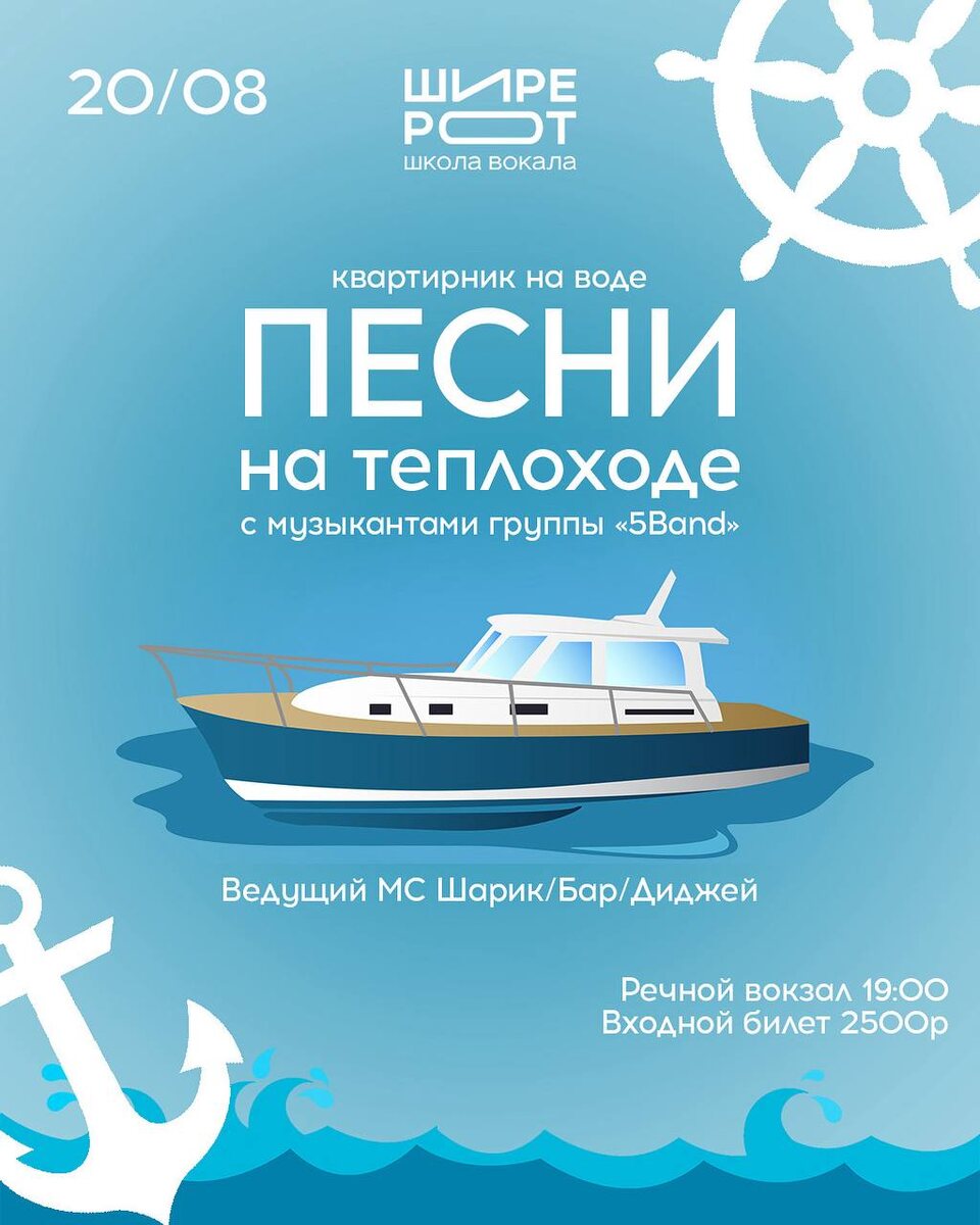 КВАРТИРНИК НА ТЕПЛОХОДЕ!🛳️🎶 Событие, которое все ждали! 20 августа отплываем от «Речного вокзала» и плывем в увлекательное музыкальное путешествие вместе с «ШИРЕРОТ»!💙 КОЛИЧЕСТВО БИЛЕТОВ СИЛЬНО ОГРАНИЧЕНО! С нами на борту: - любимые музыканты @5band_show - любимый МС Шарик @mc_sharrik - бар - диджей - любимые песни - фотограф Будет сильно круто!! Залетай на бомбическое событие вместе с нами, на борт теплохода «ШИРЕРОТ»!! Билет: 2500р Пиши срочно @shirerot