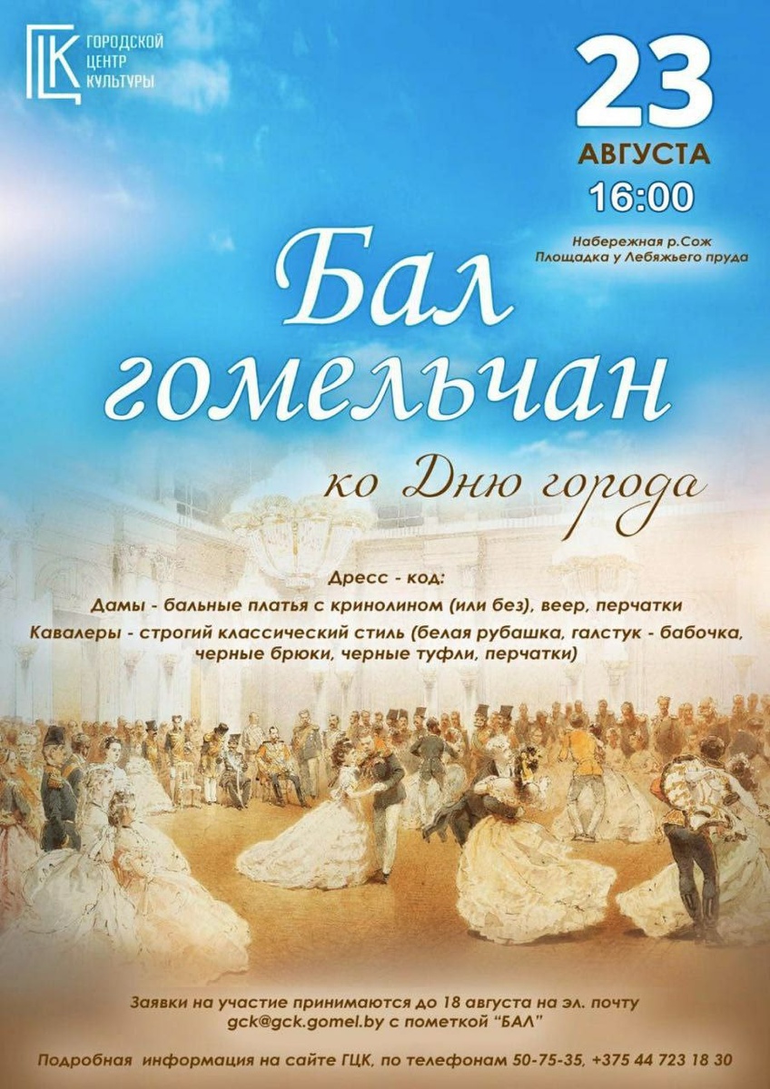 23 августа состоится IV общегородской бал гомельчан, посвященный Дню города В бальной карте двух отделений – вальсы, марши, полонезы, польки, кадрили, менуэты. Летний вечер станет особенно незабываемым от прекрасной оркестровой музыки и великолепных мелодий в исполнении солистов городского центра культуры и городских оркестров Заявки на участие принимаются до 18 августа на эл.почту gck@gck.gomel.by. В настоящее время проводятся мастер-классы по подготовке к балу. Подробную информацию Вы можете получить по 50-75-35, +375-44-723-18-30.